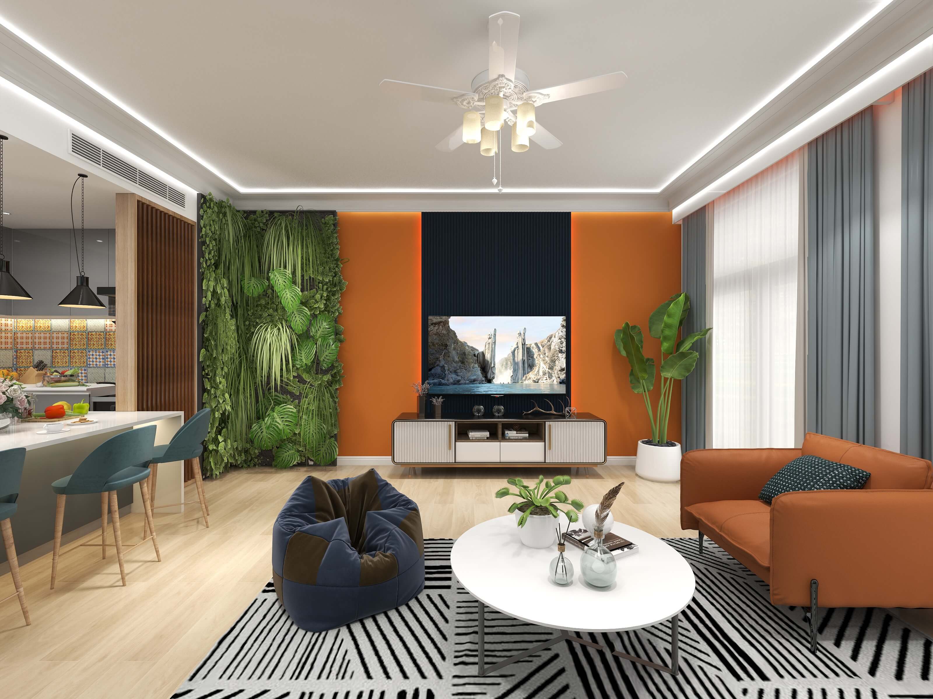 The living room design fuses an array of styles, patterns, and textures, creating a vibrant and visually stimulating space that celebrates individuality and artistic expression